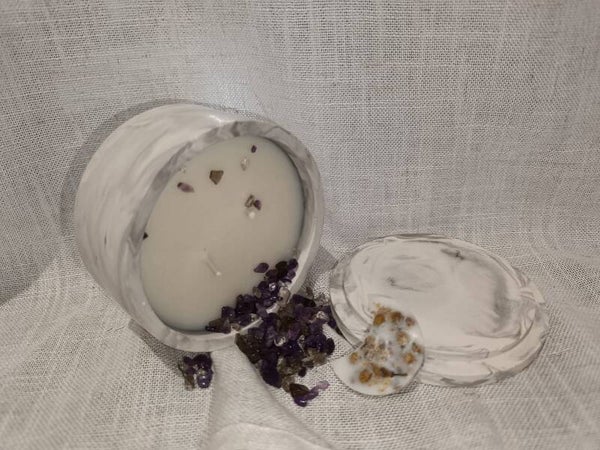 Chacune des herbes séchées et pierres fines est choisie en fonction de l'intention de la bougie. Ces pierres apportent l'apaisement, le calme, purifient ou bien vous protègent.