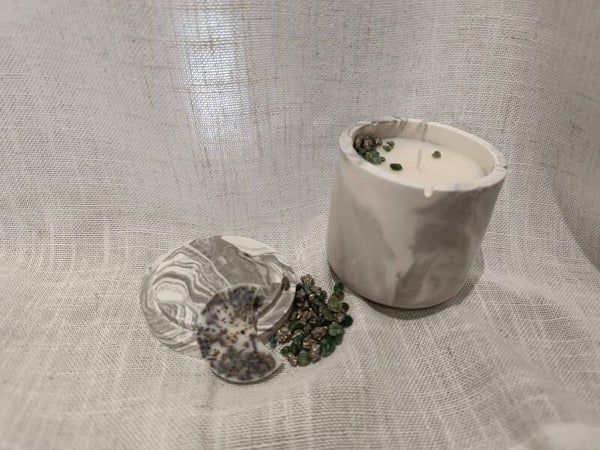 Chacune des herbes séchées et pierres fines est choisie en fonction de l'intention de la bougie. Ces pierres apportent l'apaisement, le calme, purifient ou bien vous protègent.